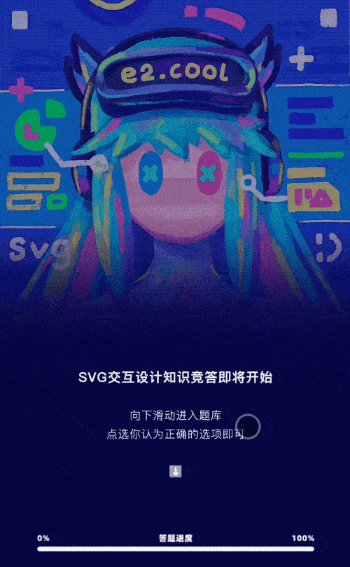 基于混合模式原理搭建,实现进度式滑动与答题环节的完美契合。目前该效果可通过 E2 编辑器的「进度滑动」、「四选一切换」等组件搭建完成。