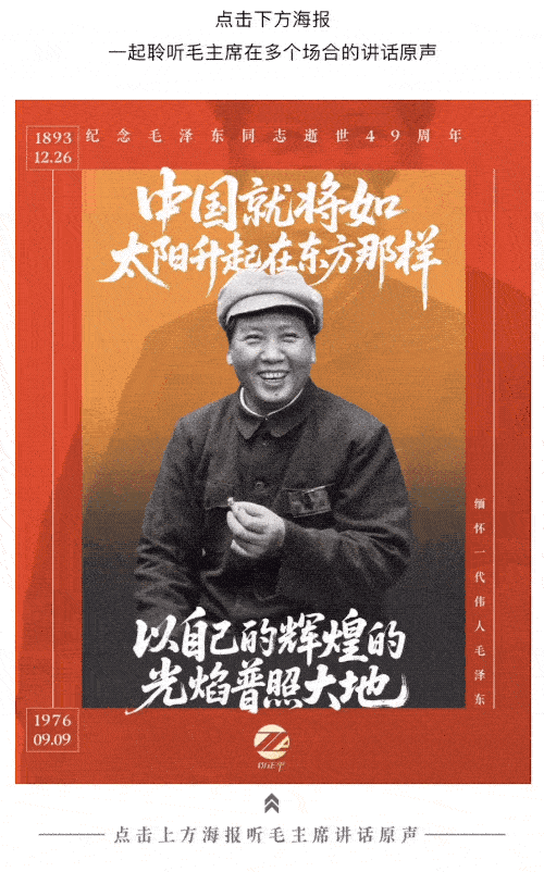毛泽东同志逝世 49 周年纪念日,创意选用有声海报的形式还原讲话现场,目前该效果可通过 E2 编辑器的「切换图片+播放音频」等组件搭建完成。