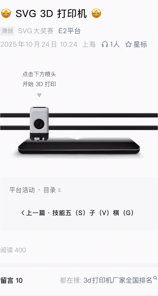 点击下方 3D 打印机喷头,喷头迅速左右移动启动,透明耗材即刻挤出!打印造型一边纵向拉长,一边推进信息呈现:先是基础打印结构向上延伸,奖品清单率先浮现;紧接着打印造型继续纵向拉长,「1024 节专属活动」、「投稿至管理员」等信息逐行堆叠「打印」显现,活动关键信息始终清晰附着在不断拉长的打印结构上。