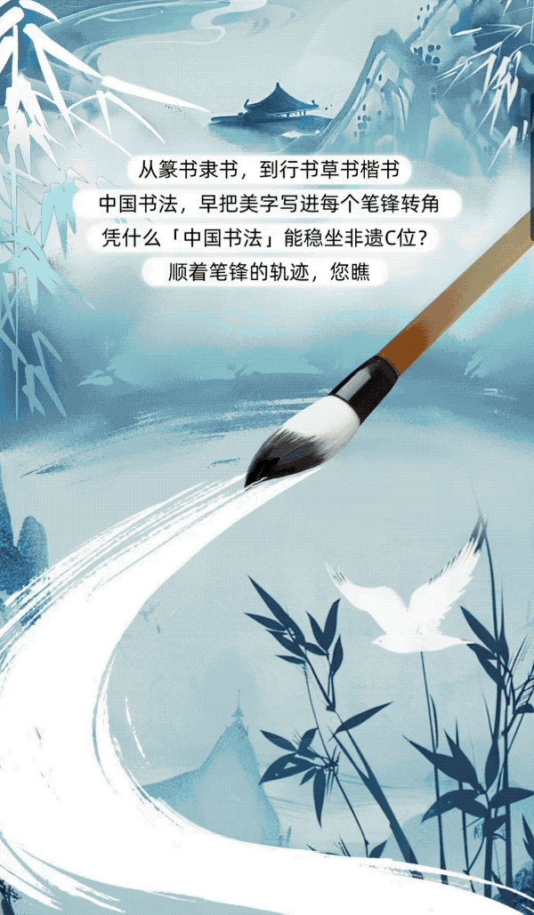 本作以毛笔为核,金色墨水逐步晕染,解锁非遗书法的文化魅力,前景镂空背景上色的设计让体验更具沉浸感。目前该效果可通过 E2.COOL 黑科技 SVG 编辑器的「零高图片」和「纵向滑动(自定义)」等组件搭建完成。
