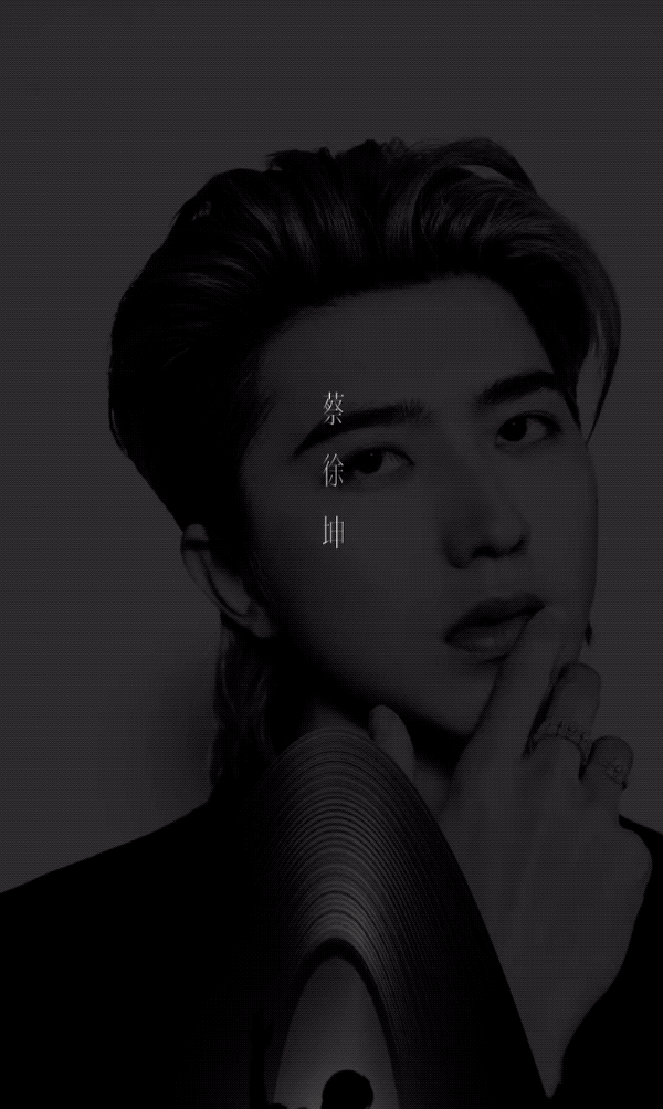 在 3D 空间中,黑胶碟分切出不同空间,将蔡徐坤的音乐曲目、歌词动画和 MV 动画节选悬浮布局其中,背景画面轮播人物特性,效果高级而优雅。