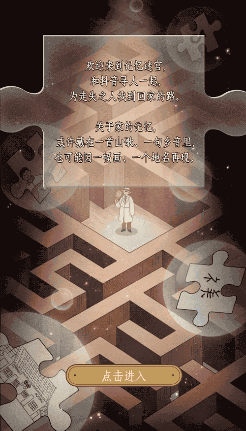 字节跳动打造趣味交互内容,点击进入页面切换至迷宫场景时,伪音频视频同步播放,点击拼图触发对应事件,记忆相册也会随点击操作逐步变得清晰,交互设计巧妙,带来沉浸式的视觉体验。