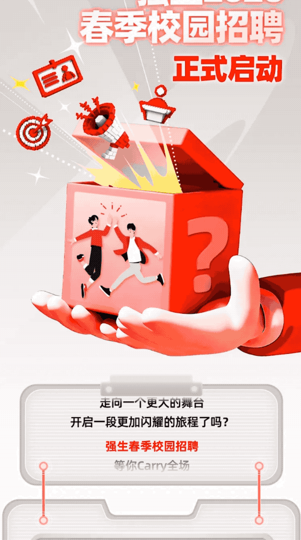 拼豆盲盒自带持续晃动的自动动画,视觉上十分醒目。点击这个晃动的拼豆盲盒,强生集团旗下全量校招信息立刻浮现,含多领域岗位、招聘要求及申请通道。想退出的话,点击页面返回按钮,招聘信息弹窗就会快速关闭,操作简单,一键解锁春招核心内容。