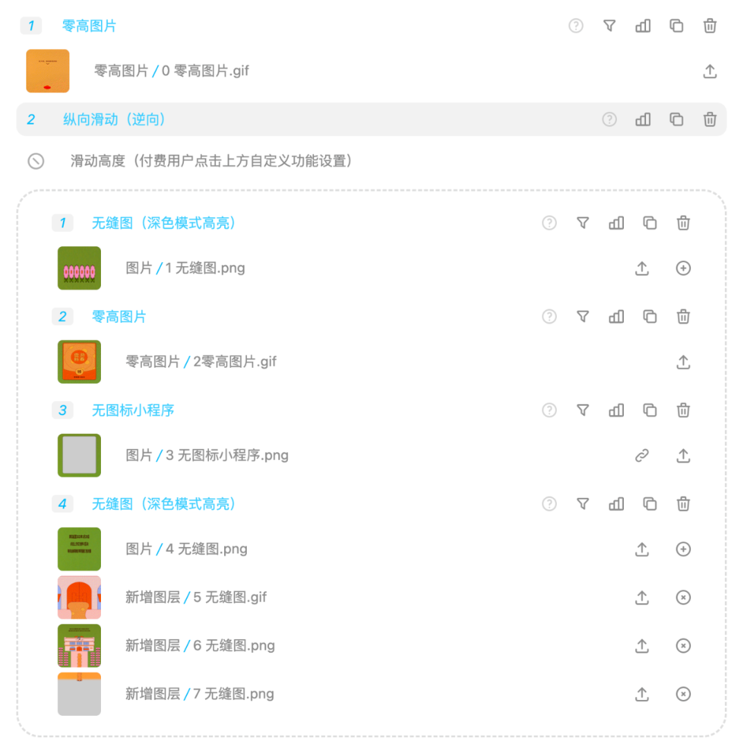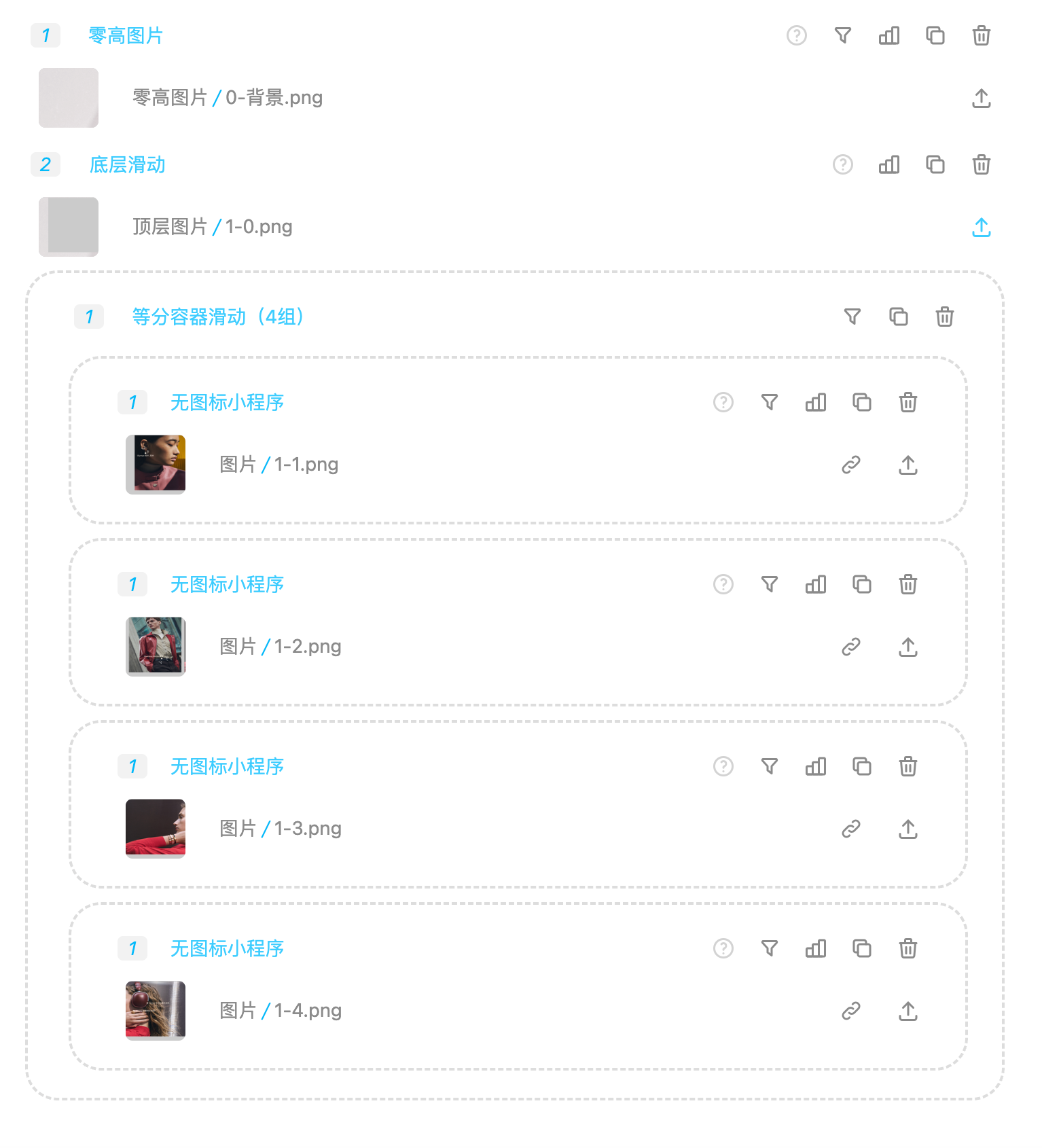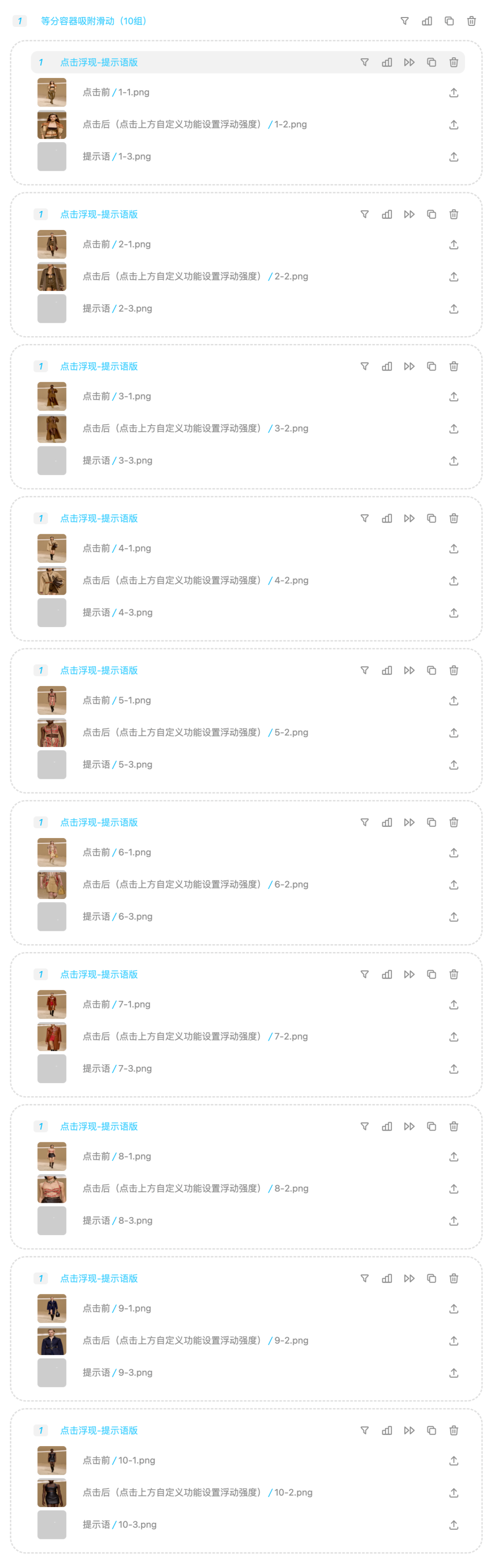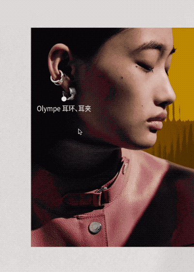 顶层设镂空浮层,底层为爱马仕模特图,点击即可跳转购买链接。滑动时模特图呈非等宽效果,交互流畅,既显品牌质感,又让浏览具动态趣味。该效果可以用 E2 编辑器「底层滑动」搭配「等分容器滑动」实现。