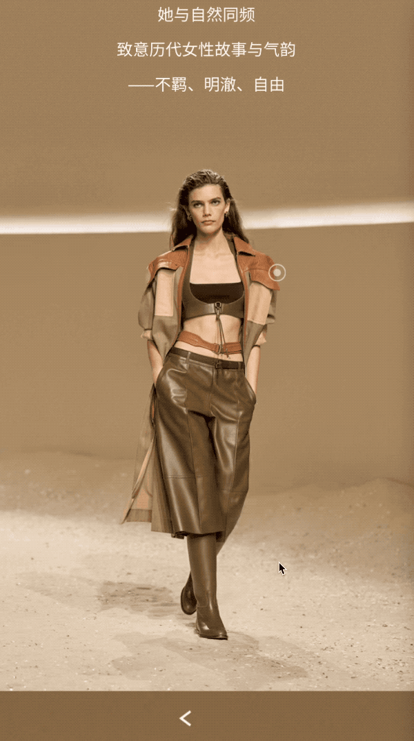点击模特图后,原页面提示符平滑隐去,爱马仕 2026 春夏女装大图以淡入效果渐显,伴随轻微放大动态,让服装细节如面料纹理、剪裁线条逐步清晰。整体动效轻盈不拖沓,贴合 「自由驰骋于清风中”」的秀场主题,自然聚焦服装本身,提升视觉沉浸感。 该效果可以用 E2 编辑器「等分容器吸附滑动」搭配「点击浮现」实现。
