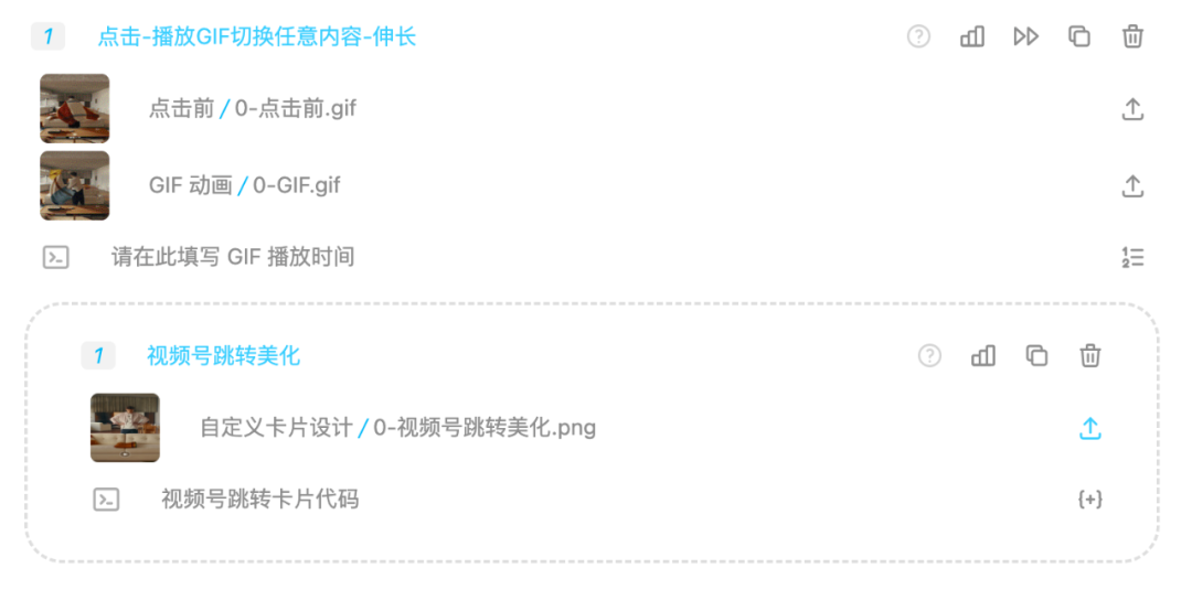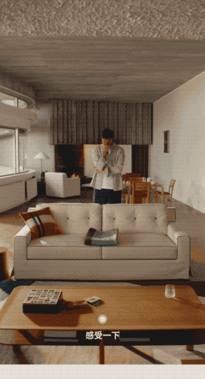 点击爱马仕毛毯的场景图,即刻触发动效:另一张 GIF 场景流畅播放,动态呈现织物质感与场景氛围,待 GIF 图片播放完毕,画面无缝切换至爱马仕视频号,全程衔接自然,动感十足。该效果可以用 E2 编辑器「点击-播放GIF切换任意内容-伸长」实现。
