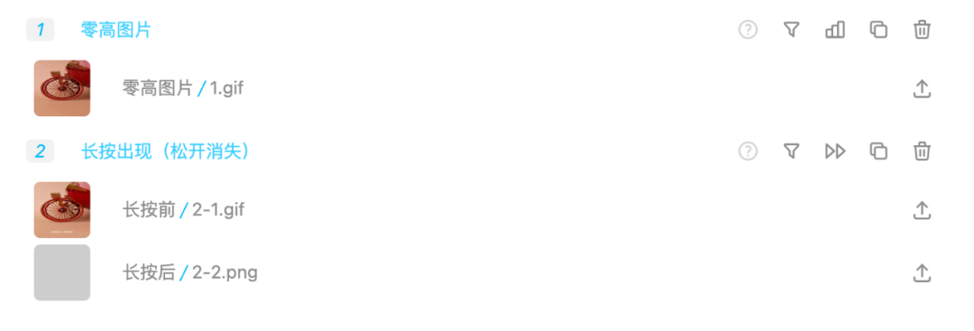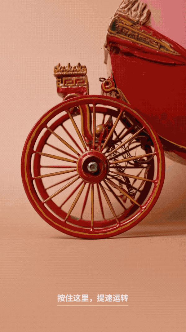 长按博物馆物件图,该图会渐隐,同时由其创意设计的物品动态图快速播放;松开长按后,画面便回到作为灵感来源的原物件图,展现设计灵感与成品的关联。该效果可以用 E2 编辑器「长按出现(松开消失)」实现。