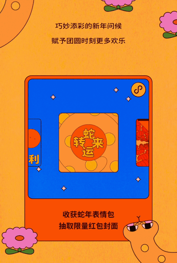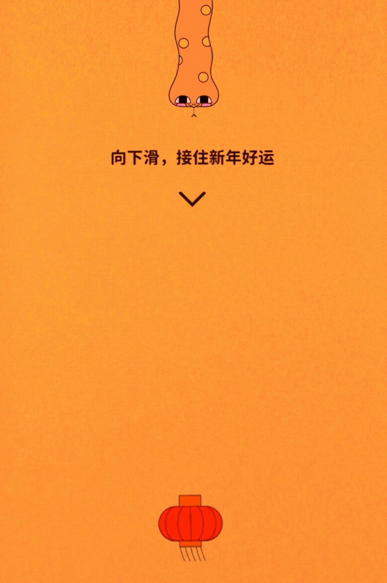 爱马仕蛇年新春微信活动排版超吸睛! 开屏「向下滑动,接住新年好运」提示符醒目呈现。当用户逆向滑动屏幕,灵动的蛇似在水中穿梭,身姿蜿蜒。随着滑动缓缓向下游动,带动画面逐一清晰呈现,最后醒目的红包图标出现,点击红包,页面便快速跳转到转盘游新春的页面。该效果可以用 E2 编辑器「纵向滑动(逆向)」实现。