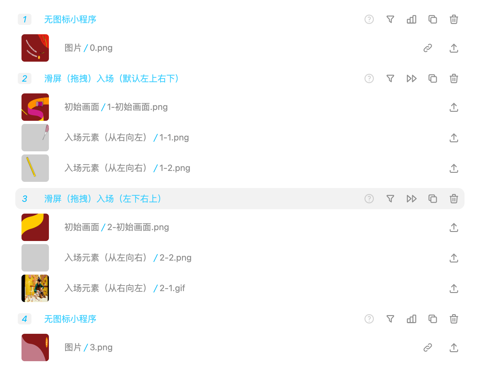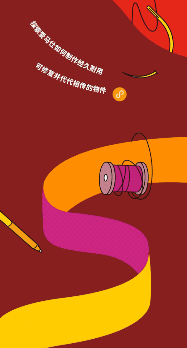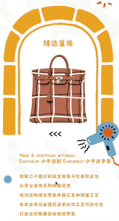 当我们滑动进入爱马仕匠心工坊页面,左右侧精致小物件随划动轻盈进入,动效让画面更富活力。该效果可以用 E2 编辑器「滑屏(拖拽)入场」实现。