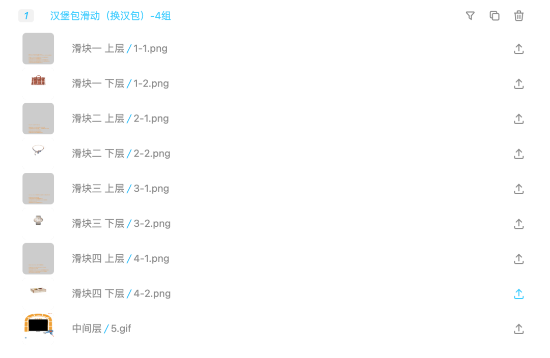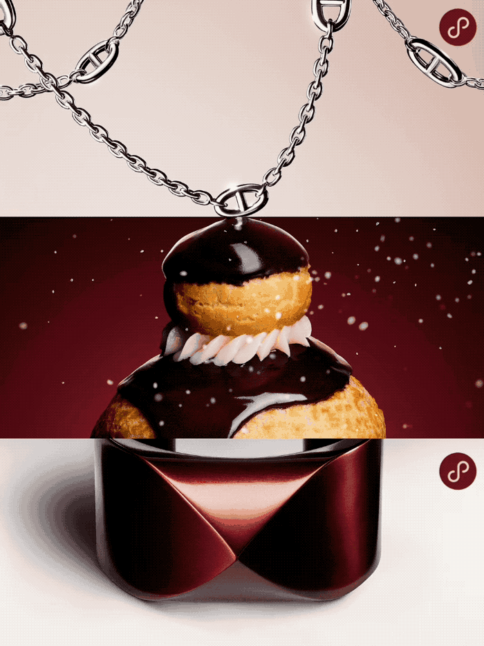 门框夹层始终固定,无丝毫位移;顶层文案与爱马仕产品底层则呈双向滑动态势,一静一动形成鲜明对比。滑动过程流畅连贯,动态交织间将品牌精致质感具象化。该效果可以用 E2 编辑器「汉堡包滑动(换汉包)」实现。